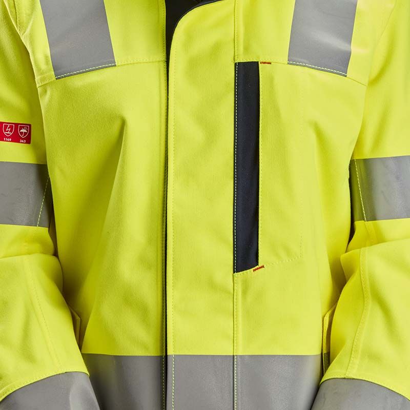 - Certificering: EN ISO 20471 Klasse 3 (hoge zichtbaarheid), EN ISO 11612 (bescherming tegen hitte en vlammen), EN ISO 11611 Klasse 1 (laswerk en verwante processen), EN 61482-2 (bescherming tegen elektrische vlambogen), EN 13034 (bescherming tegen vloeibare chemicaliën), EN 343 (bescherming tegen regen), EN 1149-5 (antistatische eigenschappen)